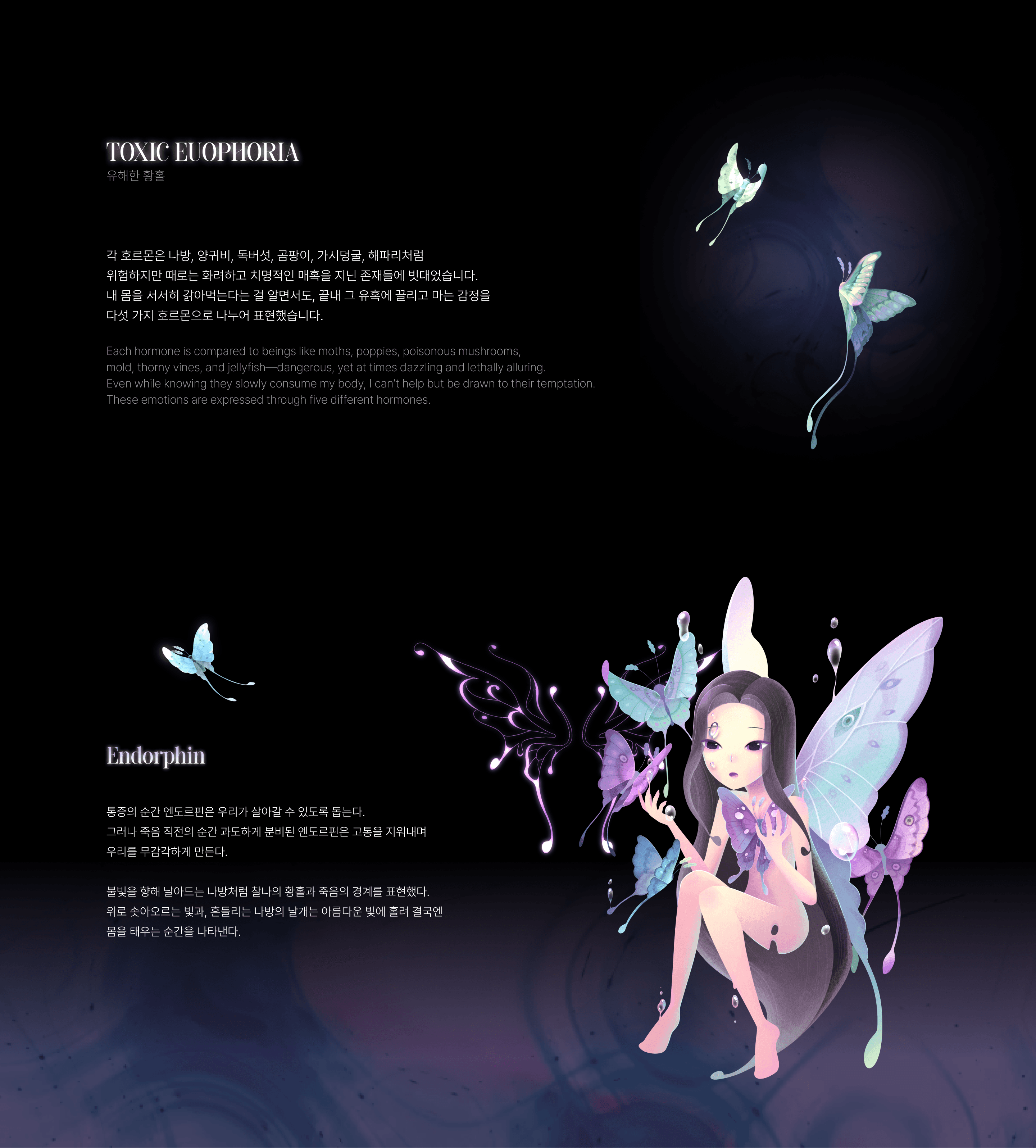 Toxic Euphoria, 유해한 황홀이라 불리는 이 아이러니하고 모순적인 순간은, 아름다움과 파멸이 맞닿아 공존하는 치명적인 찰나이다.
