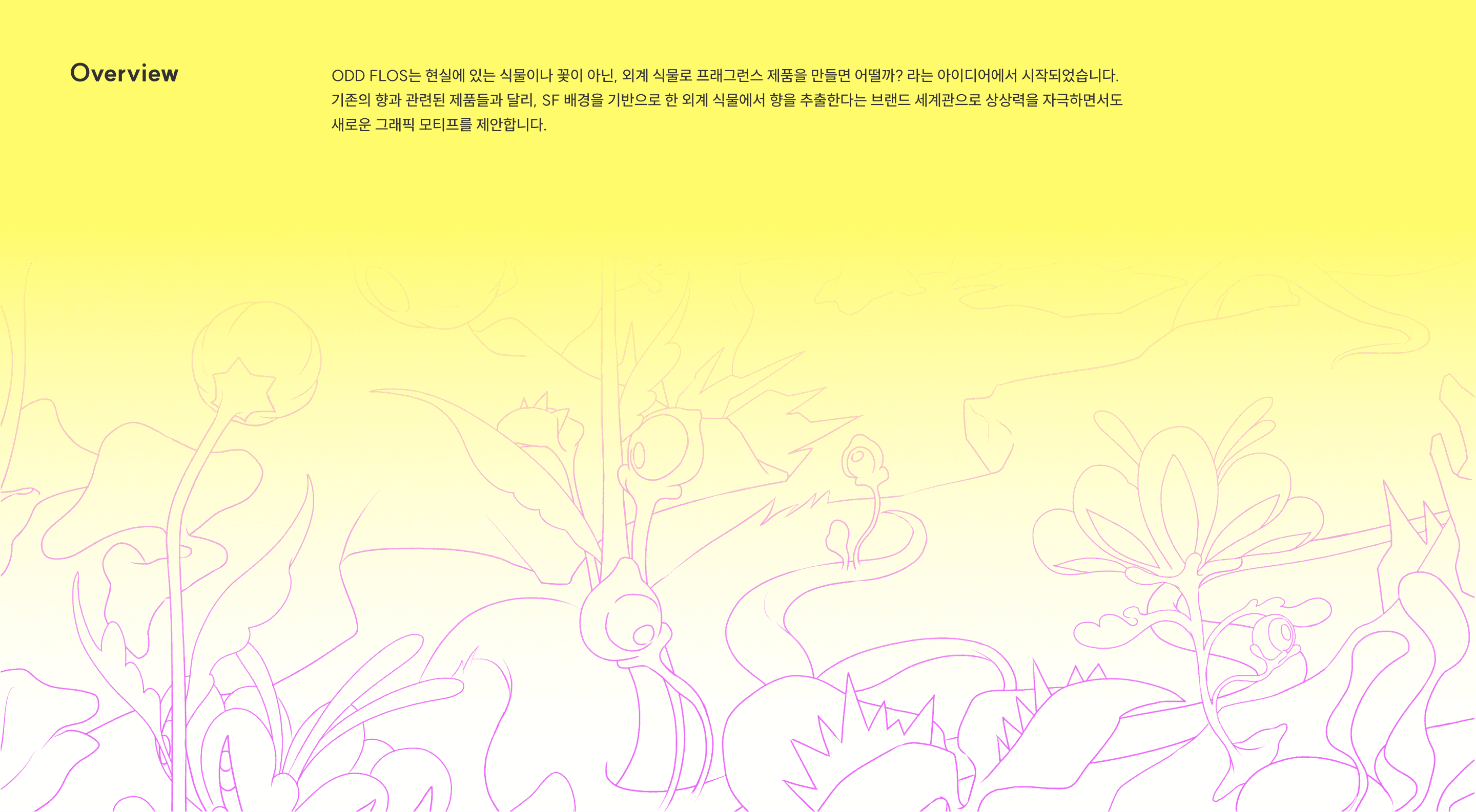 자연은 인간이 예측할 수 없어 무섭기도, 두렵기도 하지만 그렇기에 더욱 아름답죠. ODD FLOS는 그 기이함 속에서 피어나는 아름다움에 주목하여 설계된 SF 배경의 프래그런스 브랜드입니다. 꽃과 식물이 즐겁게 춤을 추며 폭죽을 터뜨리고, 때로는 독을 풀어낸다면 어떨까?
